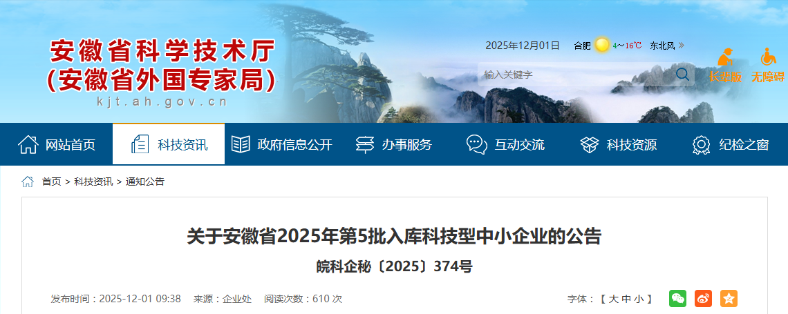 根据《科技型中小企业评价办法》(国科发政〔2017〕115号)和《科技型中小企业评价服务工作指引》(国科火字〔2022〕67号)要求,我省2025年第5批2942家拟入库科技型中小企业已在“科技型中小企业服务平台”公示10个工作日。公示期间由风险核验和自查筛选出45家异议企业,经核实后共有34家企业不符合科技型中小企业入库条件。现将通过公示的安徽省2025年第5批2908家入库科技型中小企业名单(详见附件)予以公告。