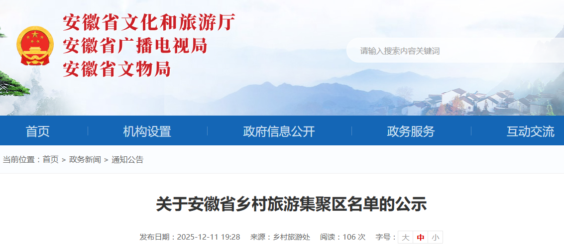 为深入推进乡村振兴战略,推动乡村旅游高质量发展,贯彻落实《关于推动文化和旅游深度融合发展全域旅游把文化旅游业打造成为支柱产业的意见》《安徽省实施精品示范工程 打造“皖美休闲旅游乡村”行动方案》等部署要求,经各市申报、专家评审、现场答辩和综合评议,现将安徽省乡村旅游集聚区名单公示如下(见附件)。