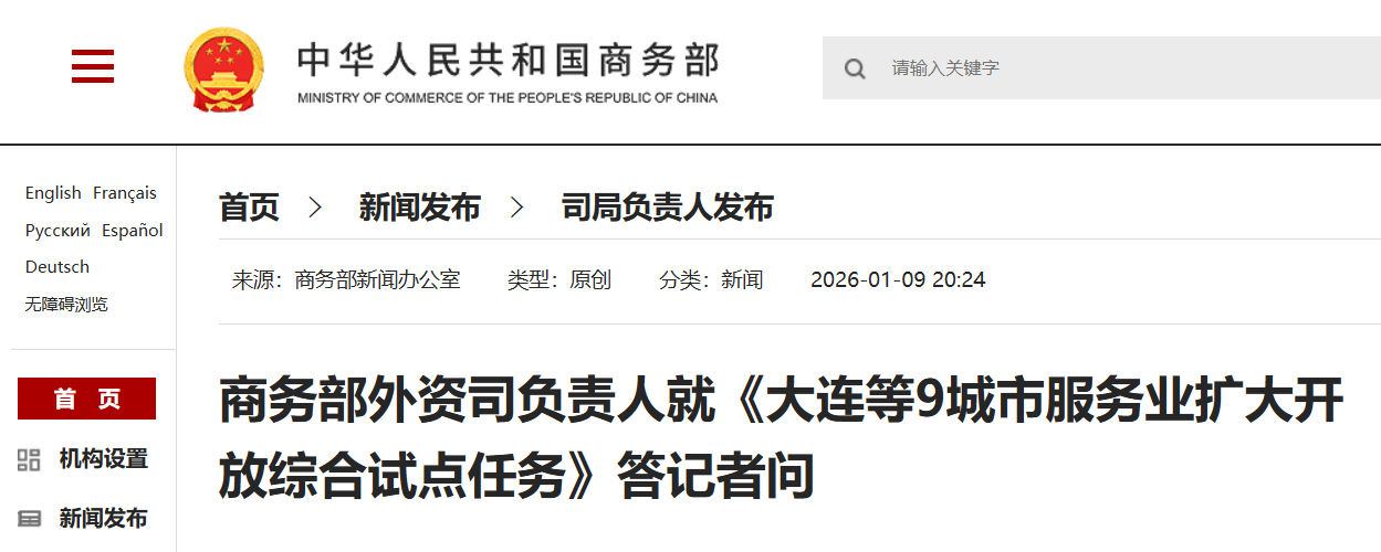 近日,经国务院同意,商务部印发《大连等9城市服务业扩大开放综合试点任务》(以下简称《试点任务》)。为了解《试点任务》有关情况,记者采访了商务部外资司有关负责人。