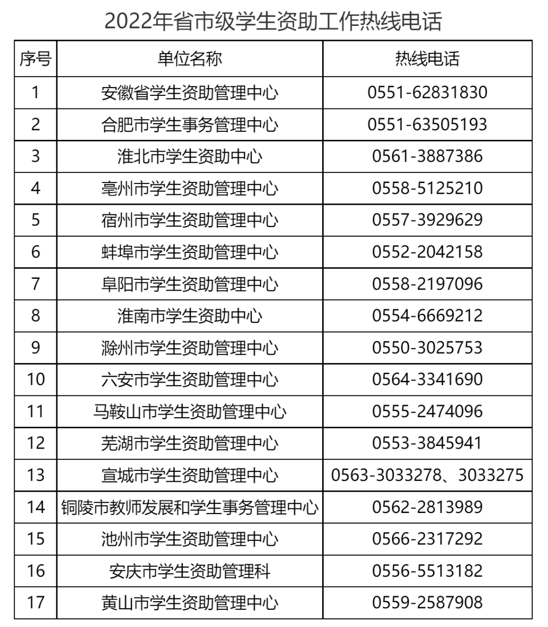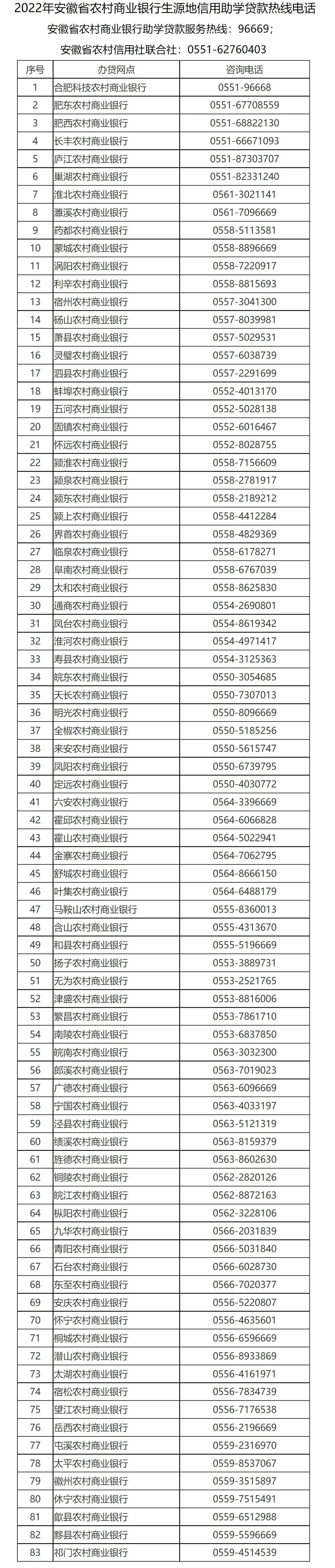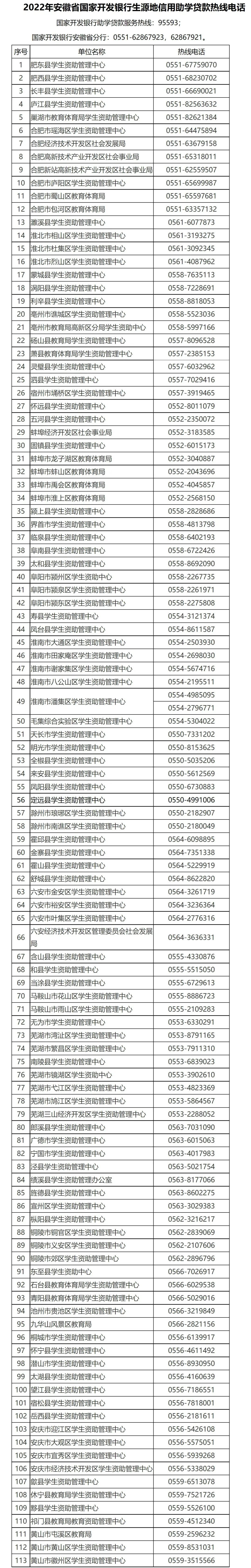 为有效帮助家庭经济困难学生和家长及时准确了解学生资助政策,顺利申请办理生源地信用助学贷款,我省2022年7月15日起,开通安徽省生源地信用助学贷款工作热线电话(见附件1-3),热线电话集中受理阶段为7月15日至10月20日(工作日),每天受理时间为8:00-12:00 、14:30-17:30。广大学生和家长如有生源地信用助学贷款方面的疑问,均可拨打生源地信用助学贷款热线电话。