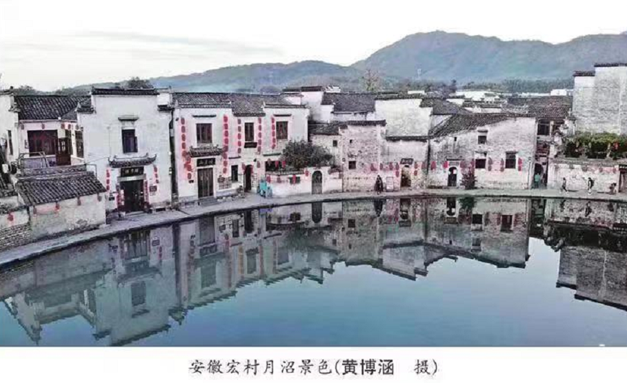 画面中,如镜般的月沼,倒映着蓝天白云和粉墙黛瓦的徽州古民居,将天地万物神奇地融合为一幅美丽的画卷,悠远而恬静……