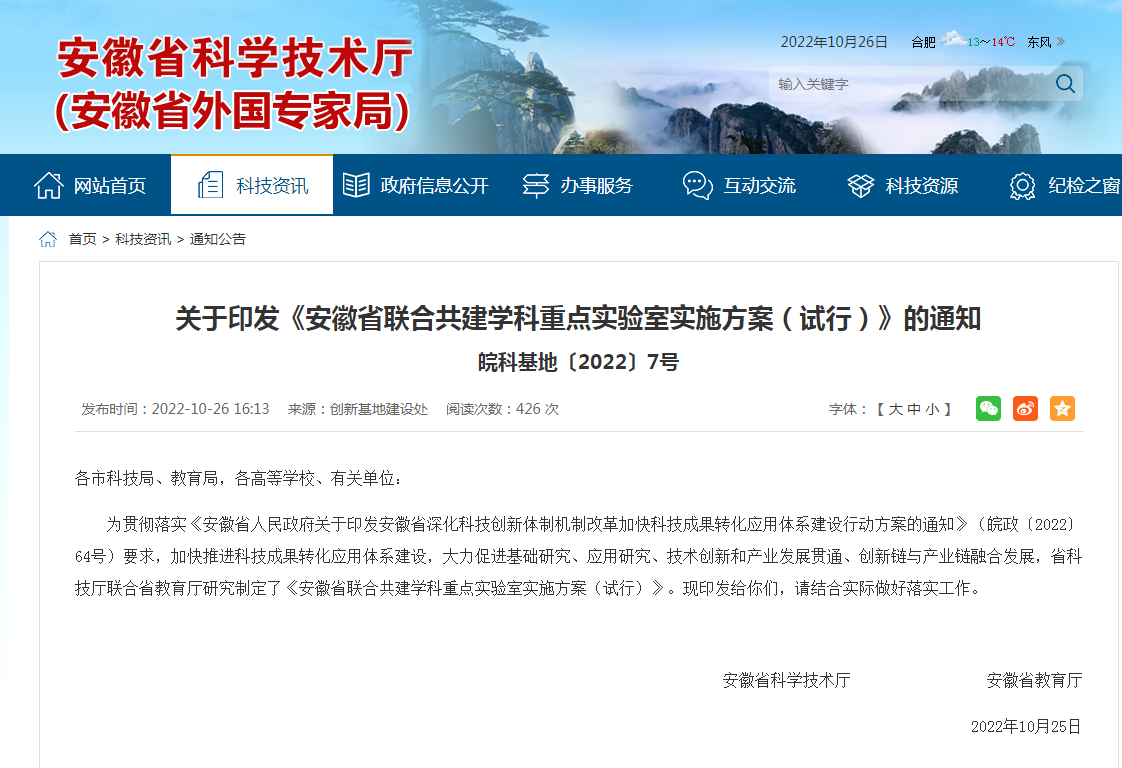 近日,安徽省科技厅联合省教育厅研究制定并印发《安徽省联合共建学科重点实验室实施方案(试行)》,其中提出,到2025年,我省培育建设(含转建)联合共建学科重点实验室(以下简称“联合实验室”)100家以上。