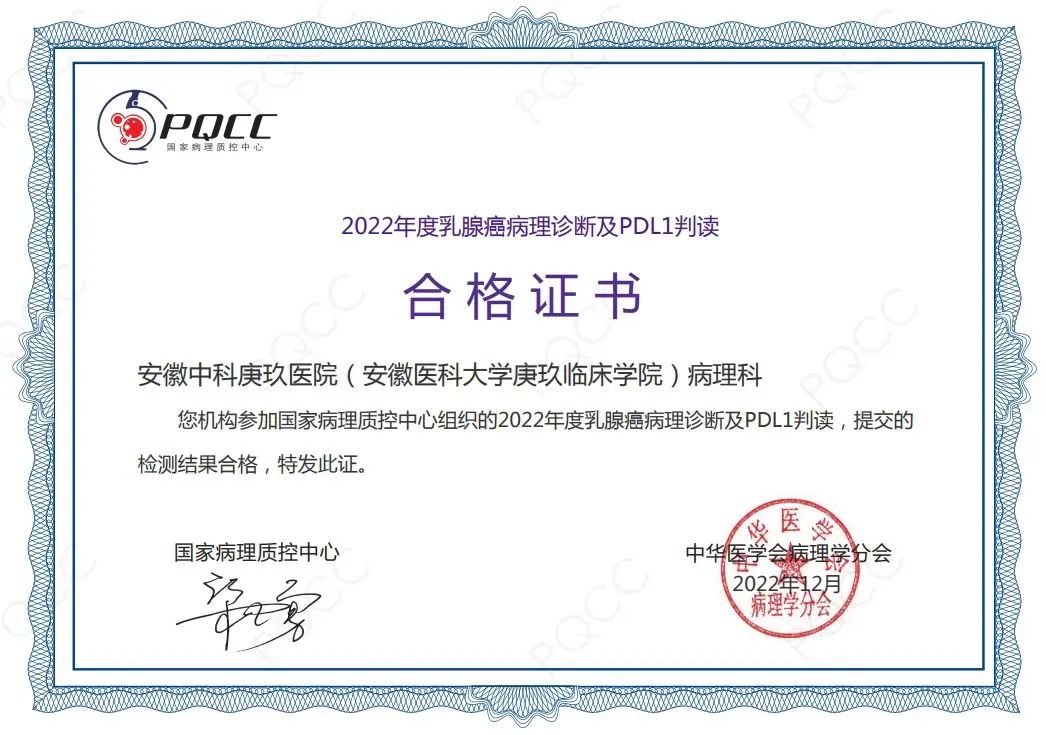 近日,国家病理质控中心(PQCC)发布了“2022年度乳腺癌病理诊断及PDL1判读能力验证专项计划”结果。中科庚玖医院病理科在外聘专家中国科学技术大学附属第一医院(安徽省立医院)病理科何杰主任的指导下,以优异成绩顺利通过了该项能力验证专项计划,并获得中华医学会病理学分会颁发的证书。 (来源:中科庚玖微信公众号)