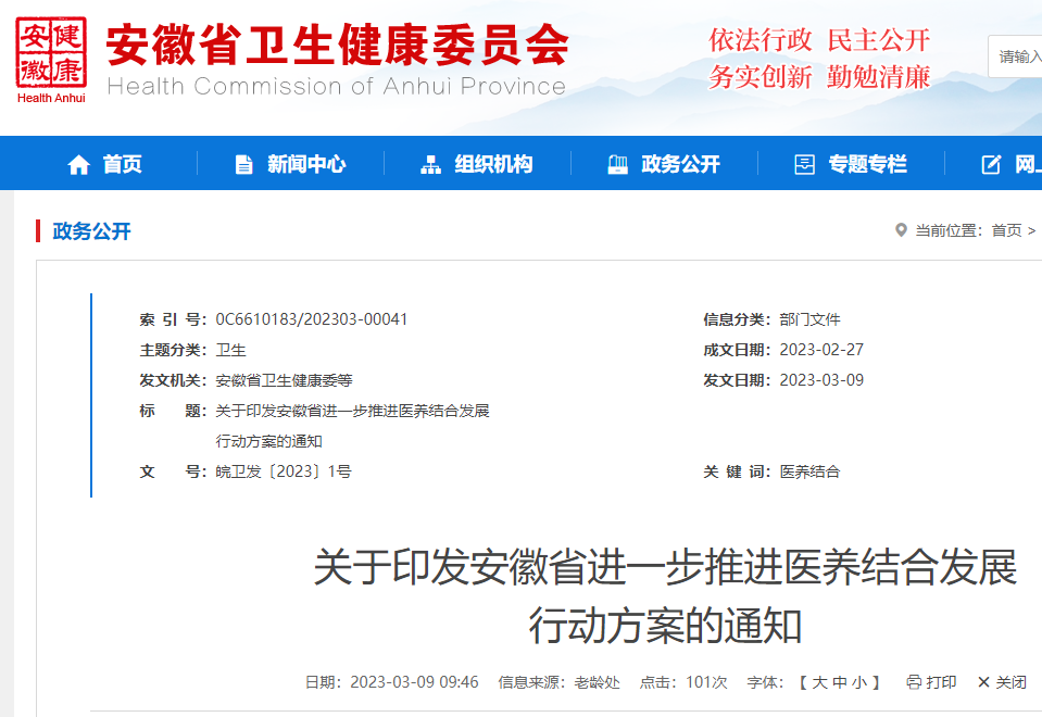 近日,经安徽省政府同意,省卫生健康委、省发展改革委、省民政厅等十一部门印发了《安徽省进一步推进医养结合发展行动方案》(以下简称《行动方案》),并进行解读。行动方案提出了将符合条件的养老机构内设医疗卫生机构纳入医保定点管理,落实“属地管理、省内互认”政策。