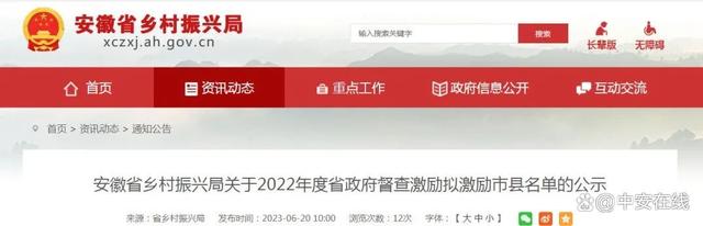 近日,安徽省乡村振兴局网站发布公示,一市五县入选2022年度省政府督查激励拟激励市县名单。