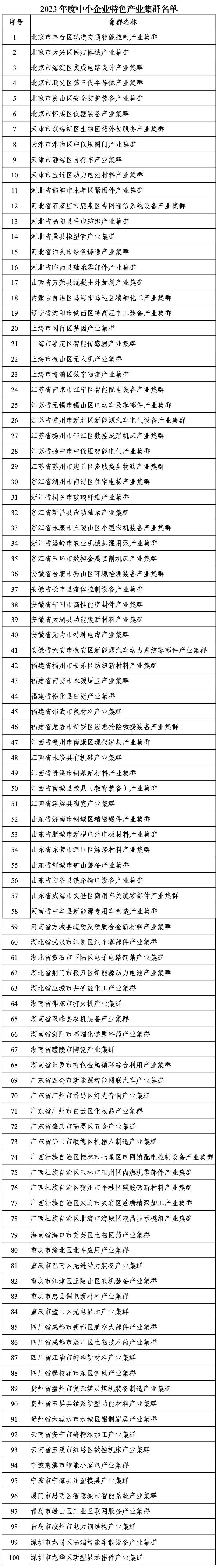按照《促进中小企业特色产业集群发展暂行办法》(工信部企业〔2022〕119号)和《工业和信息化部办公厅关于组织推荐2023年度中小企业特色产业集群的通知》(工信厅企业函〔2023〕44号),经各省级中小企业主管部门组织申报推荐、专家评审和公示,确定了2023年度中小企业特色产业集群名单(见附件,以下简称集群),现予以通告,并提出有关工作要求。
