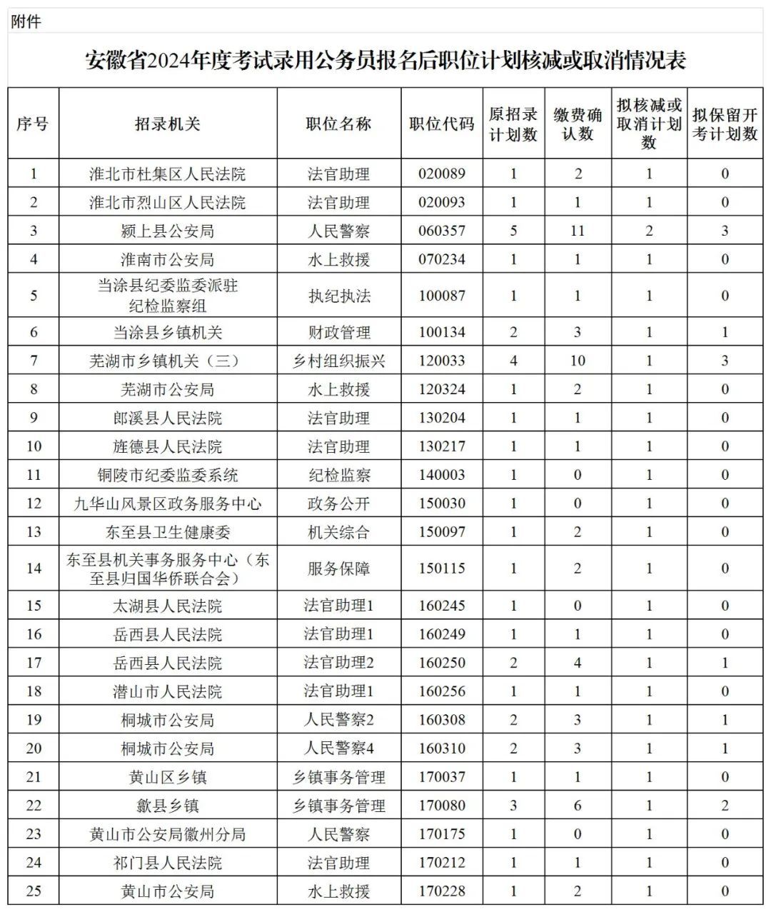 附件:安徽省2024年度考试录用公务员报名后职位计划核减或取消情况表