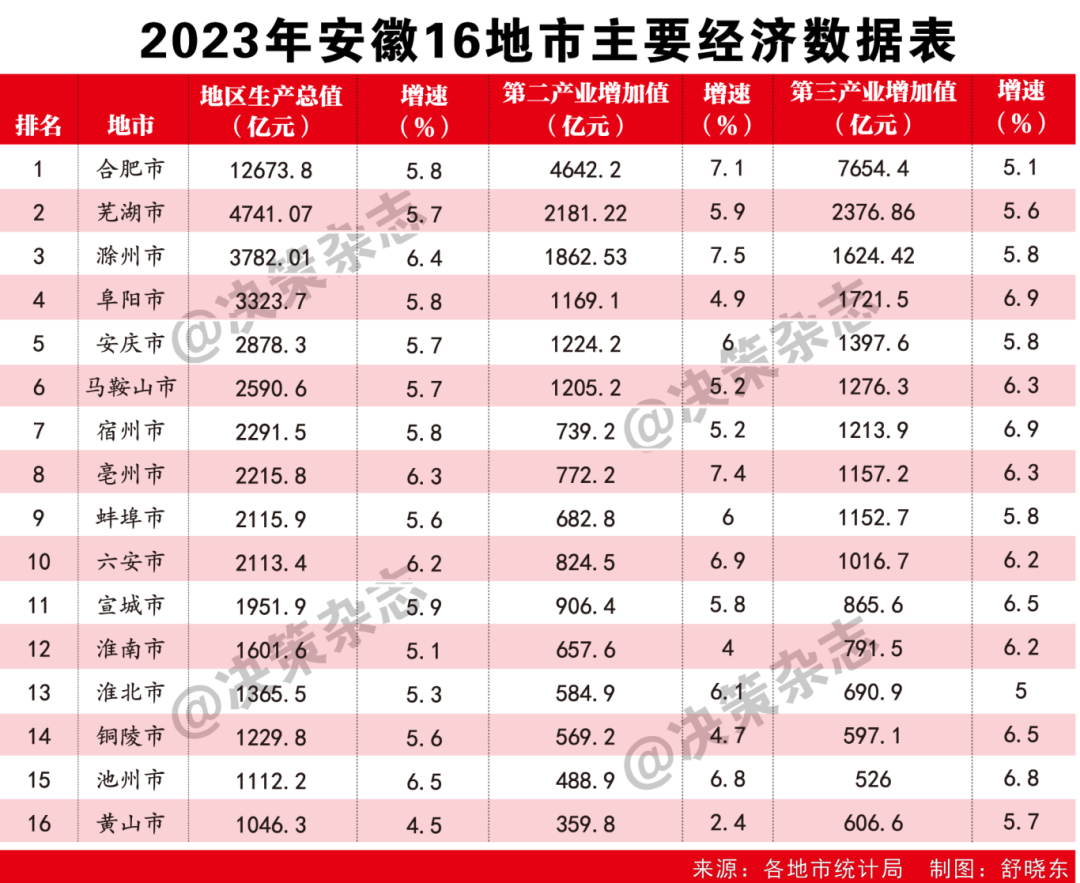 随着淮北市发布2023年经济运行数据,安徽16地市2023年经济发展“成绩单”揭晓! 安徽16地市的经济发展格局保持稳定,有5个地市跑赢了安徽的增速5.8%,分别是 滁州、亳州、六安、宣城、池州; 合肥、阜阳、宿州与全省经济增速持平。 你的家乡表现如何?一起来看。 (来源:决策杂志)