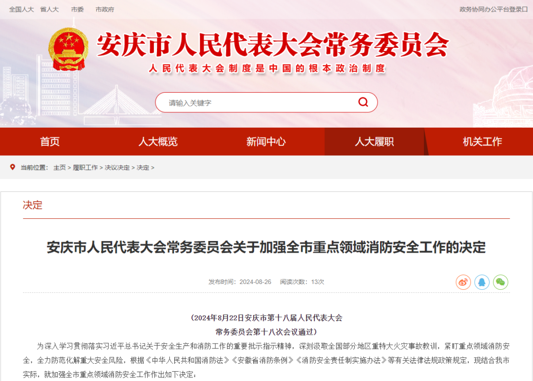 2024年8月22日,安庆市第十八届人民代表大会常务委员会第十八次会议通过《关于加强全市重点领域消防安全工作的决定》,在全省率先制定出台了具有本地特色的消防管理地方性法规,为有效做好全市重点领域消防安全工作提供法规依据。