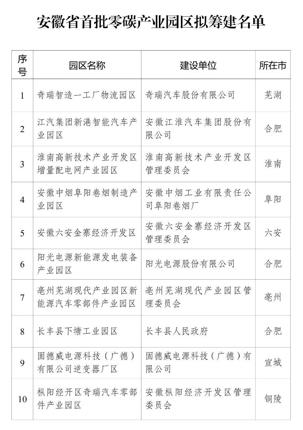 附件:安徽省首批零碳产业园区拟筹建名单
