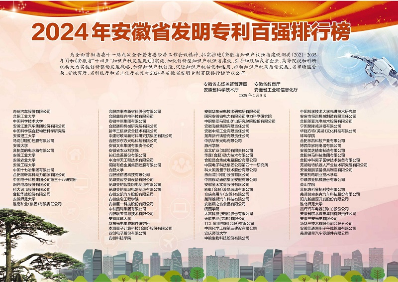 2月5日,安徽省市场监督管理局、安徽省科学技术厅、安徽省教育厅、安徽省工业和信息化厅联合发布2024年安徽省发明专利百强排行榜。入榜单位共拥有发明专利62630件,较上年增长13.0%,占全省有效发明专利32.0%。