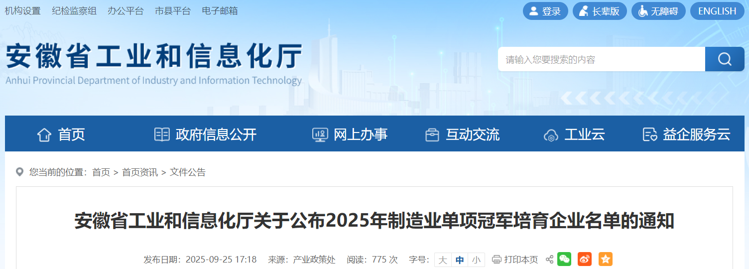 根据工业和信息化部《制造业单项冠军企业认定管理办法》(工信部政法〔2023〕138号和《关于组织开展2025年制造业单项冠军培育企业入库推荐工作的通知》要求,经企业申报、所在地工信部门审核推荐、专家评审、公示等程序,确定2025年安徽省制造业单项冠军培育企业名单,现予以公布。