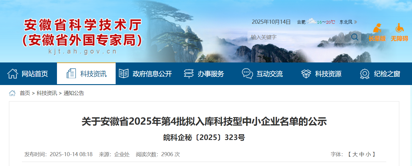 根据《科技型中小企业评价办法》(国科发政〔2017〕115号)和《科技型中小企业评价服务工作指引》(国科火字〔2022〕67号)有关规定,现将安徽省2025年第4批6884家拟入库科技型中小企业名单(详见附件)予以公示,公示期为10个工作日。